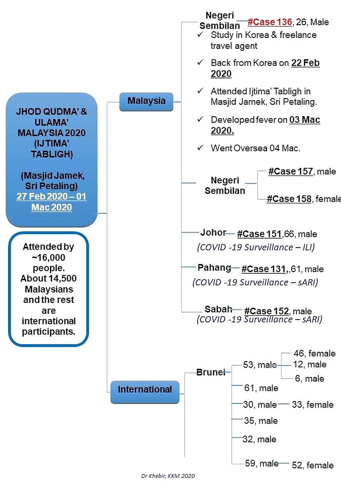 In a diagram posted by health director-general Datuk Noor Hisham Abdullah on Facebook early this morning, six Malaysians attending the tabligh event have been confirmed with COVID-19 infection, including three from Negeri Sembilan, and one each from Johor, Pahang and Sabah.