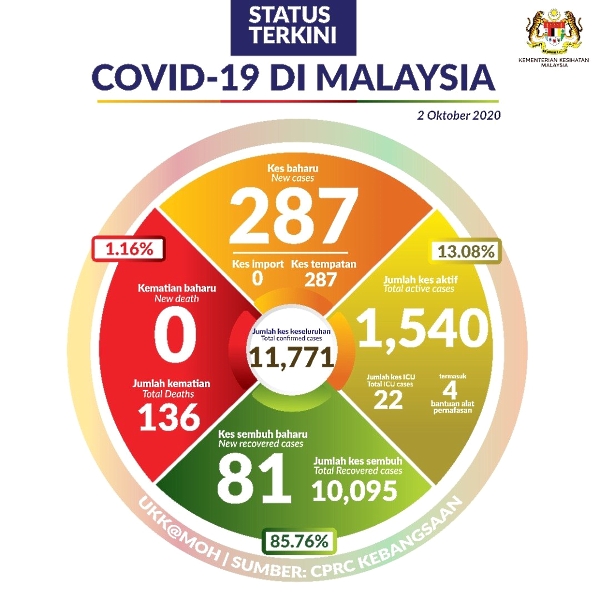 PUTRAJAYA, Oct 2 (Sin Chew Daily) – A record of 287 new COVID-19 cases were reported in the country as of noon today, all locally transmitted.