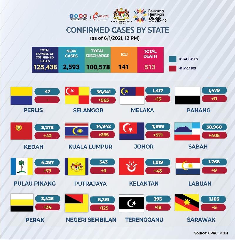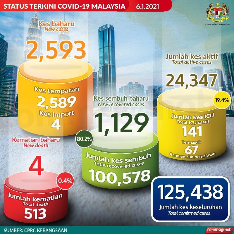 PUTRAJAYA, Jan 6 (Sin Chew Daily) – A record of 2,593 new COVID-19 cases were reported in the country as of noon today, including four imported cases.