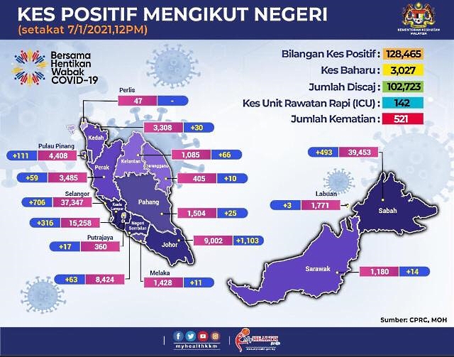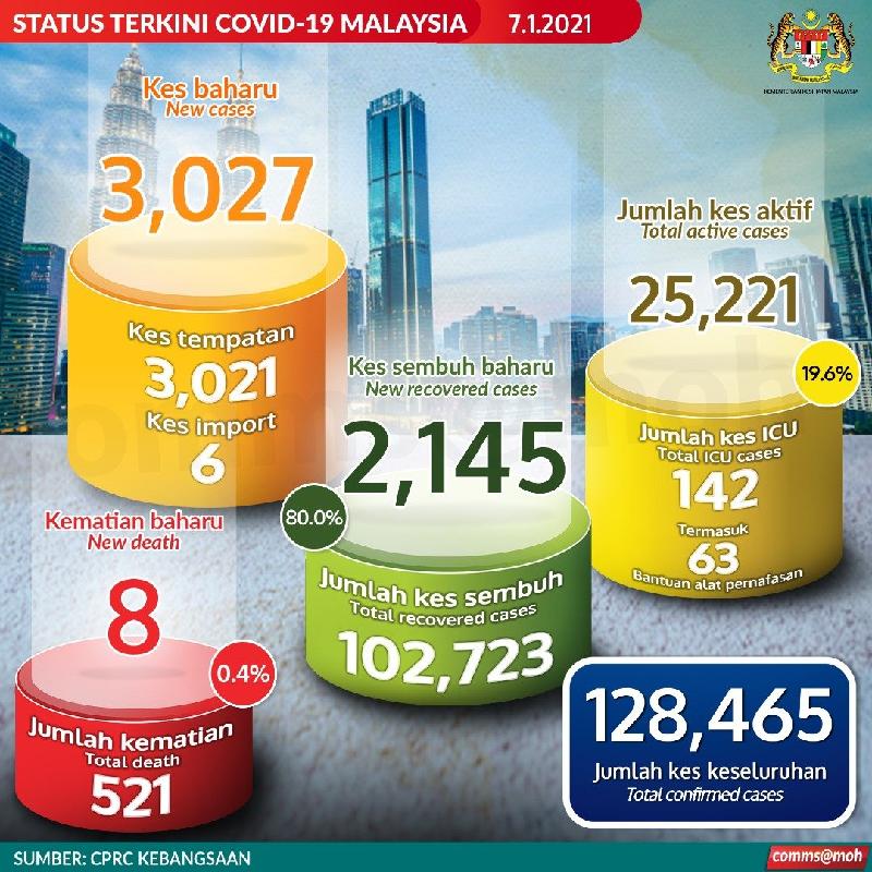 PUTRAJAYA, Jan 7 (Sin Chew Daily) – A record 3,027 new COVID-19 cases were reported in the country as of noon today, including six imported cases.