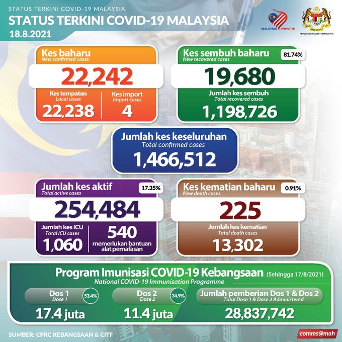 PUTRAJAYA, Aug 18 (Sin Chew Daily) – A record 22,242 new COVID-19 cases were reported in the country as of noon today, including four imported cases.