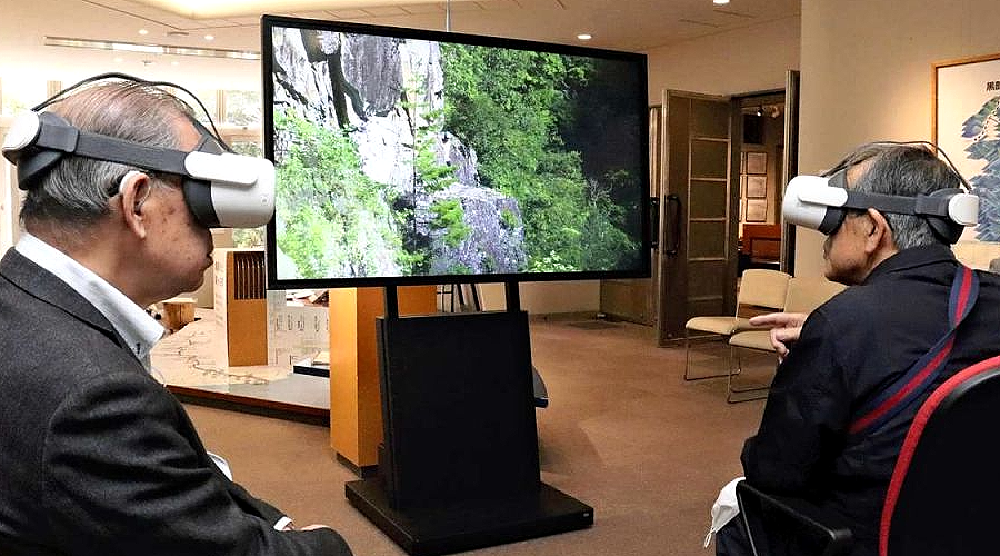 Visitors watch 360-degree video footage while wearing virtual reality headsets at the Museum in Kurobe, Toyama Prefecture. THE YOMIURI SHIMBUN