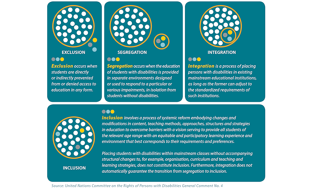 This is best illustrated by a diagram explaining exclusion, segregation, integration and inclusion according to the CRPD.