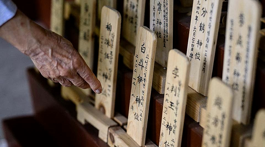 Hiroshima atomic bomb survivor Bae Kyung-mi’s hand reaches out while visiting a traditional structure holding 1,172 wooden plaques bearing the names of deceased victims, among them are Bae’s three siblings, behind the Hapcheon Atomic Bomb Victim Welfare Center. AFP