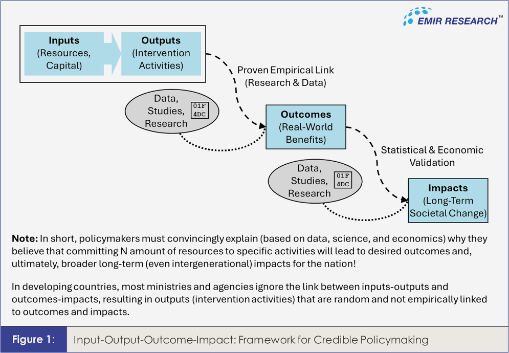 Institutionalizing the Input–Output–Outcome–Impact (IOOI) framework across government is critical. As EMIR Research argued in “Transforming Malaysia from third- to first-world country” and “Recalibrating national budget: Eradicating leakages and corruption”, IOOI provides the logic chain that ensures resources translate into real outcomes and impacts, while curbing leakages and embedding accountability (Figure 1).