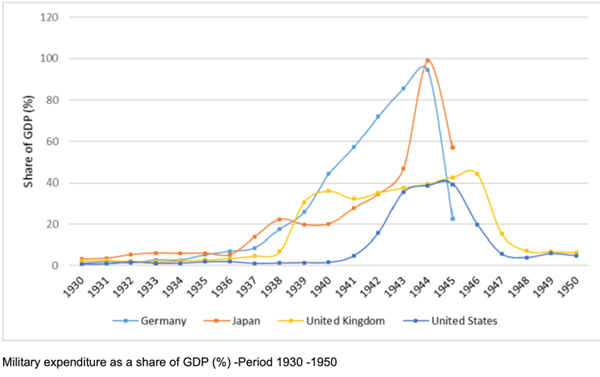 The United States were slow to react, with an average spending of 1-2 percent of GDP between 1930–1938, but she rapidly ramped up to as much as 40 percent of GDP by 1945.