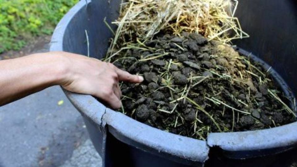 Droppings and straw are carried in a bucket to a composter once a day. THE YOMIURI SHIMBUN