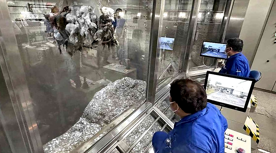 our participants watch workers operate a huge crane at the Ota Incineration Plant in Ota Ward, Tokyo. THE YOMIURI SHIMBUN