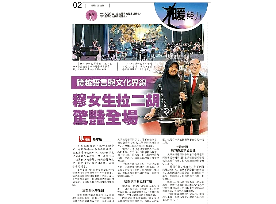MIRI: Malay student Irdina Batrisyia Mohd Faizul, who stands out among her Chinese peers with erhu performance at the school graduation ceremony in Miri, now owns an erhu, thanks to a Sin Chew Daily reader from Johor.