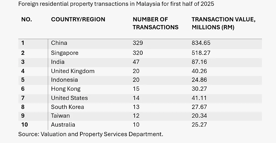 KUALA LUMPUR: Chinese nationals top Malaysian home purchases for the first half of 2025 according to residential property data from the Valuation and Property Services Department.